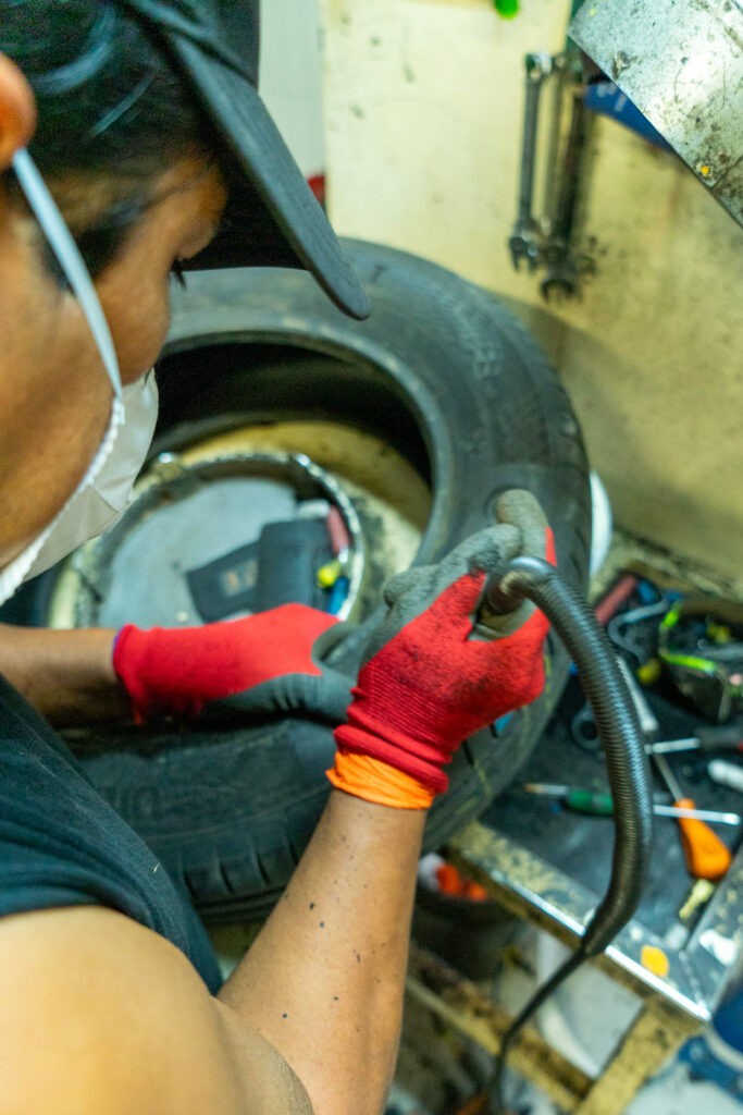 Le processus de vulcanisation suit plusieurs étapes rigoureuses afin de garantir une réparation sûre et durable. Tout d’abord, le pneu est débridé : la zone endommagée est soigneusement nettoyée et préparée pour la pose de l’emplâtre, ce qui permet d’évaluer avec précision la taille et la profondeur de la coupure.